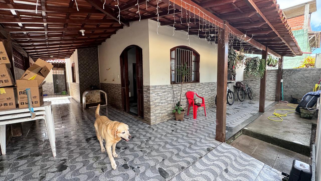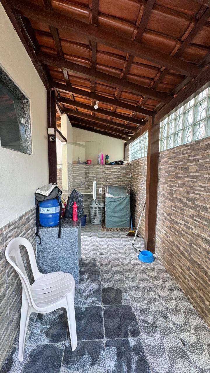 Casa com 2 pavimentos. 1º Pavimento contendo 3 quartos, sendo 1 suíte, banheiro social, área de serviço, garagem para 1 carro e uma varanda em volta da casa